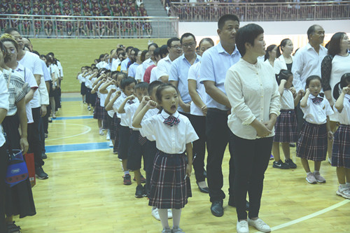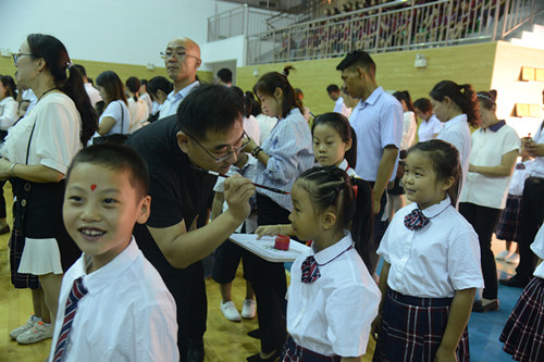 活动在嘹亮的国歌声中拉开帷幕。“入学礼”中,县实验学校一年级新生通过“正衣冠”、“点朱砂”、“赠毛笔”、“拜师长”、“入学宣誓”、“教师宣誓”等仪式环节,来感受入学是人生中一件大事,更加懂得敬爱父母老师,奋发学习, 增强爱国之情和对传统文化的认同感与归属感。