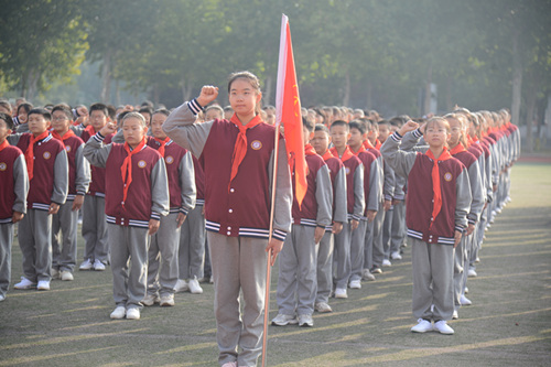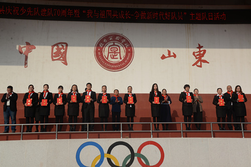 出队旗,敬队礼,齐唱《中国少年先锋队队歌》,重温入队誓词和呼号......庄重严肃的入队仪式增强了少先队员们的历史责任感和使命感。实验学校大队长宗美辰宣读少先队建队名单,县实验学校大队辅导员崔若松宣读新聘中队辅导员名单,与会人员为11个新建中队授中队旗,并为新建中队辅导员颁发聘书。县实验学校副校长李淑华讲话,要求少先队员们要立志成才,要勤奋学习、提高综合素质,努力做到修身立德、志存高远,勤学上进、追求卓越,强健体魄、健康身心,锤炼意志、砥砺坚韧。