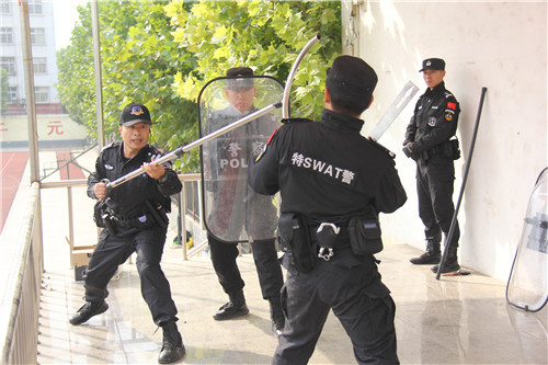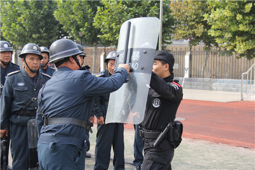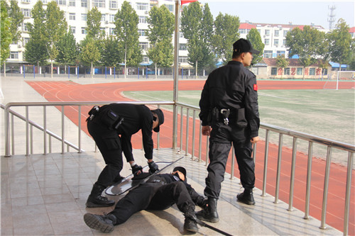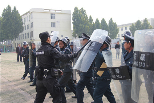 会后,桓台县巡特警大队三中队中队长毕宜明带领四位教官给参训人员讲解并演示了校园安保器械钢叉、盾牌、抓捕器、橡胶棒等正确使用方法,并组织防暴技能演练,使每一位参训人员都掌握了一定的处置突发事件的技能技巧。随后对保安职责、保安礼仪、队形训练、应急情况处置等内容进行了专业培训,全面提升了学校安全保卫的技能水平,提高了校园突发事件处置和应急能力,确保做到维护校园师生安全,促进社会和谐稳定。