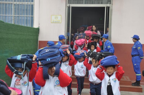活动当天,组织者将演练分防震演练和消防演练两次进行。整个演练过程中,全校师生服从指挥,听从命令,快速、安全地进行疏散撤离。防震演练时,学生们在听到避险警报后,根据所学防震知识,迅速将椅子放到课桌下,面向逃生走廊方向抱头半蹲,就地避震。疏散警报响起后,各班在老师的指引下沉着冷静、井然有序地进行疏散,头顶书包、弯腰、排两队撤离出教学楼,在操场指定位置集合。随后进行了消防演练,同学们用湿毛巾捂住口鼻弯腰排两队迅速安全疏散。在撤离过程中学生反应迅速,没有出现重合交叠、逆向跑、推挤挤压等现象。学生们有秩序地按指定路线迅速撤离至目的地。安全撤离后,各班清点人数,报告总指挥,在全体师生及活动工作人员的配合下,出色的完成了疏散演练,达到了提高自救能力的要求。