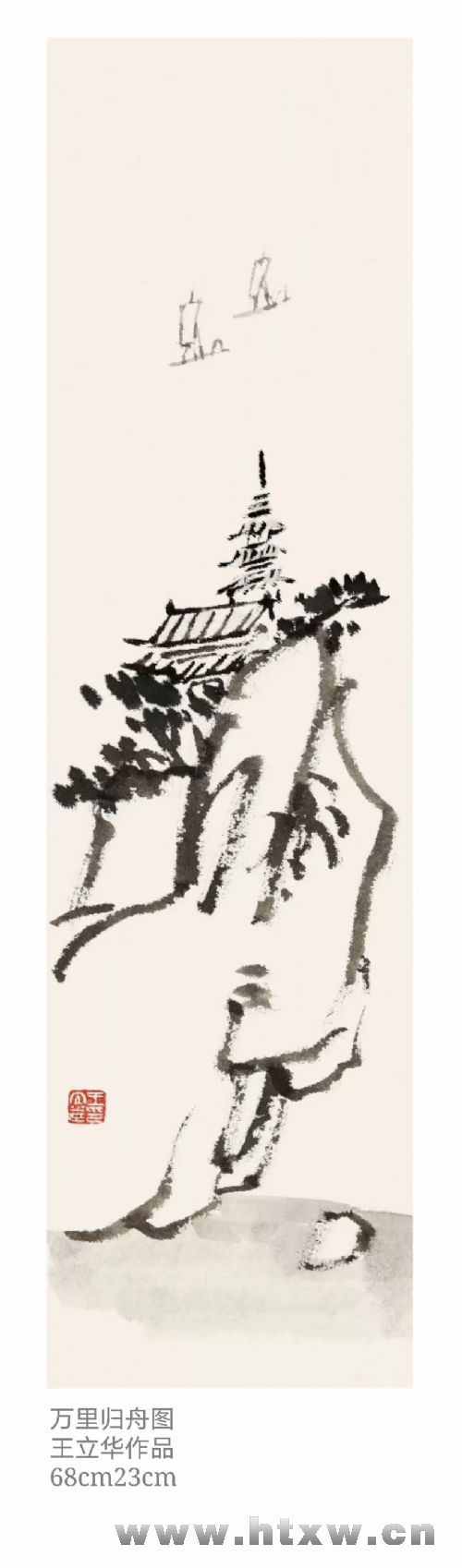 在这幅画中,画家用中国画的特点,巧妙融入了深厚的情感。山顶的数座古建筑代表着中国的传统文化;渺渺大江、远处归帆象征着孟晚舟一行回到祖国怀抱;大山则寓意着祖国是我们全体中国人的靠山;山下的小石头,说的是晚舟平安归来,全国人民心中一块石头落了地。