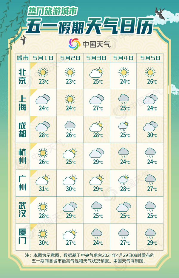 上海、杭州、厦门、广州、武汉等地,假期前半段以晴到多云天气为主,3日开始降雨增多,有意出行的小伙伴注意将户外活动安排在1日至2日,后期注意携带雨具,安全出行;