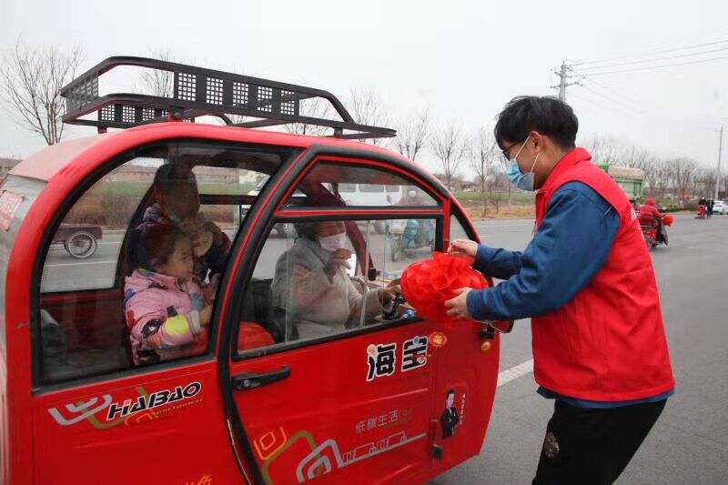 2月24日,在果里镇东义和村的大集上,桓台供电公司彩虹党员服务队员和志愿者们向村民发放《安全用电知识手册》,为村民们详细讲解安全用电知识,并将一盏盏亲手制作的大红灯笼送到了过往群众的手中。