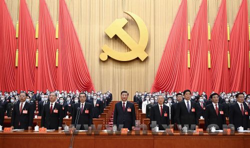 人民大会堂雄伟庄严,万人大礼堂气氛热烈。主席台上方悬挂着“中国共产党第二十次全国代表大会”的会标,后幕正中是镰刀和锤头组成的党徽,10面鲜艳的红旗分列两侧。二楼和三楼眺台上分别悬挂着“高举中国特色社会主义伟大旗帜,全面贯彻习近平新时代中国特色社会主义思想,弘扬伟大建党精神,为全面建设社会主义现代化国家、全面推进中华民族伟大复兴而团结奋斗!”“伟大、光荣、正确的中国共产党万岁!”的横幅。