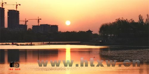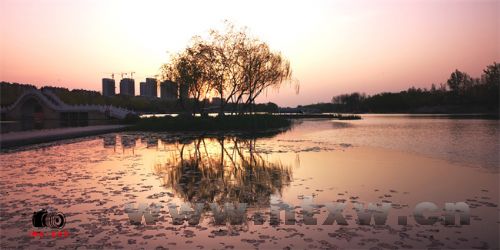 朝霞、湖面、春风、鲜花、绿树