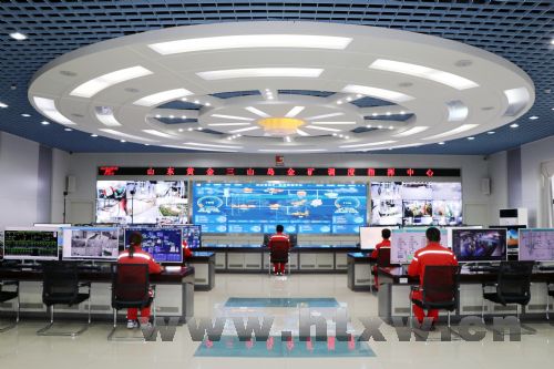 在新城金矿充填站,工作人员在控制室内值守,各个充填工序在电脑屏幕上一目了然。