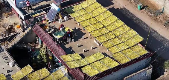 入冬以来,地处沂蒙山区的山东省枣庄市山亭区水泉镇十多个山村的农民纷纷投身红薯深加工产业,采用“蒸熟、去皮、切片、晾晒”等传统工艺加工、晾晒的红薯干连接成片,满目金黄,谱写冬日里的“金色增收曲”。走进水泉镇石户峪村,村民们趁着晴好天气忙着制作地瓜枣,一排排地瓜枣晒满房顶,金灿灿一片,空气里弥漫着地瓜的香甜。这种传统方式制作的地瓜枣,接地气,晒过太阳之后更是口感自然,咬一口满满的乡土气息。