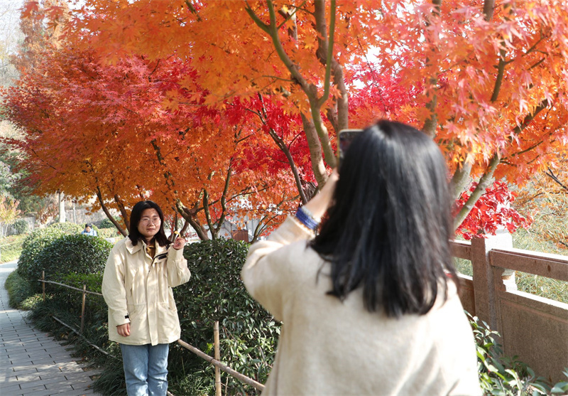 游客在红枫树下留影