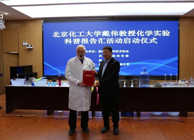 启动仪式上,北京化工大学特聘教授、北京化工大学科普实验中心主任戴伟教授获得“滨州市科普智库专家”聘书、“星火课堂”名誉教授荣誉证书。