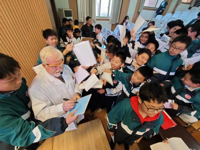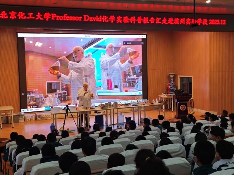 在化学实验科普报告中,戴伟教授用一口流利的中文与学生交流,与学生亲切互动,结合精彩而有趣的实验引导同学们透过表象探究本质,科学观察、积极思考、大胆提问,勇于探求真理,让同学们进一步感受到化学世界的奇妙。戴伟教授形式多变、趣味盎然的实验和特有的西式幽默极大地激发了同学们对化学实验的兴趣。戴伟教授勉励大家努力学习,成为明天的科学家。