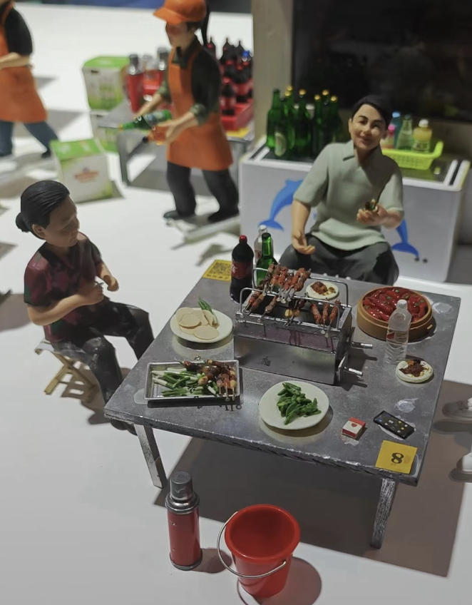 记者注意到,本组展品共有十余张“烧烤桌”,每张桌子不过十厘米见方,上面不仅有小饼、烤炉和蘸料,还有啤酒、白酒和饮料;展品中共有人物五十余位,人物围桌而坐,也都仅有二十厘米高,有的在举杯豪饮,有的在大口吃串,还有位小朋友在妈妈怀中酣然入睡,除了用餐的食客,还有从旁边站立烤串的老板、警察、志愿者等工作人员,每个人物表情动作都是栩栩如生,极富艺术感染力,惟妙惟肖地展现了淄博烧烤热闹非凡的场景。