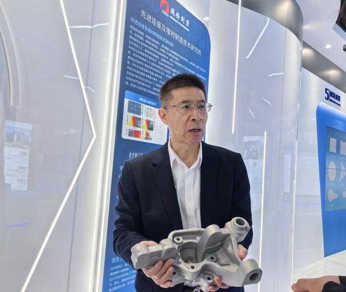 魏桥轻量化研究院院长张海展示铝合金新材料汽车零部件