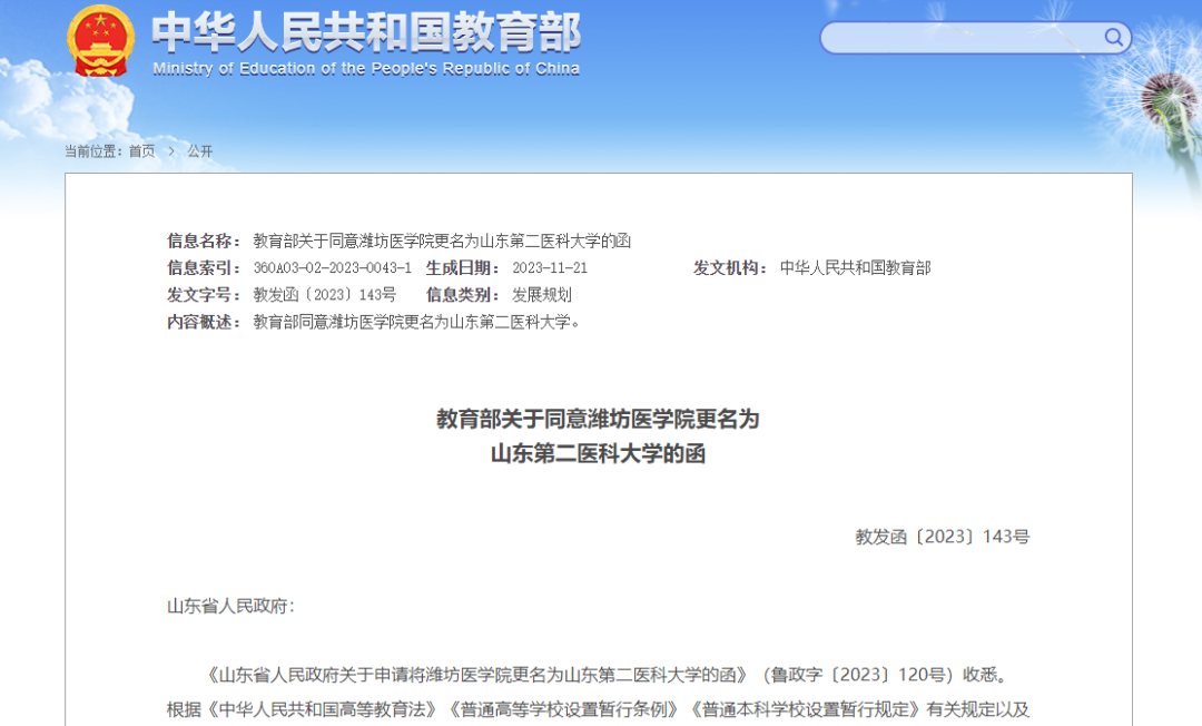 《山东省人民政府关于申请将潍坊医学院更名为山东第二医科大学的函》(鲁政字〔2023〕120号)收悉。根据《中华人民共和国高等教育法》《普通高等学校设置暂行条例》《普通本科学校设置暂行规定》有关规定以及第八届全国高等学校设置评议委员会评议结果,经教育部党组会议研究决定,同意潍坊医学院更名为山东第二医科大学,学校标识码为4137010438;同时撤销潍坊医学院的建制。现将有关事项函告如下。