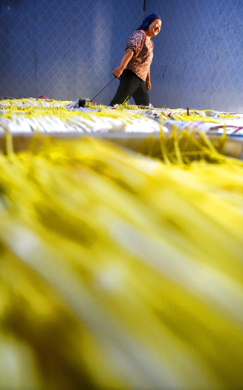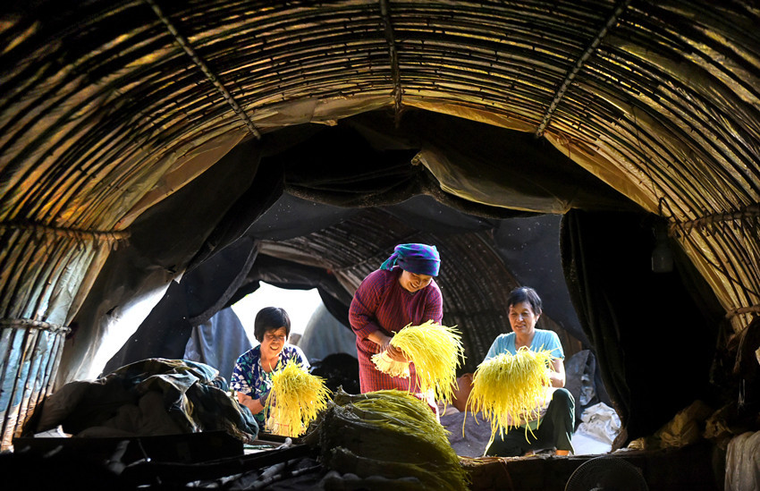 宋志玲(中)和村民们一起分拣收获的蒜黄
