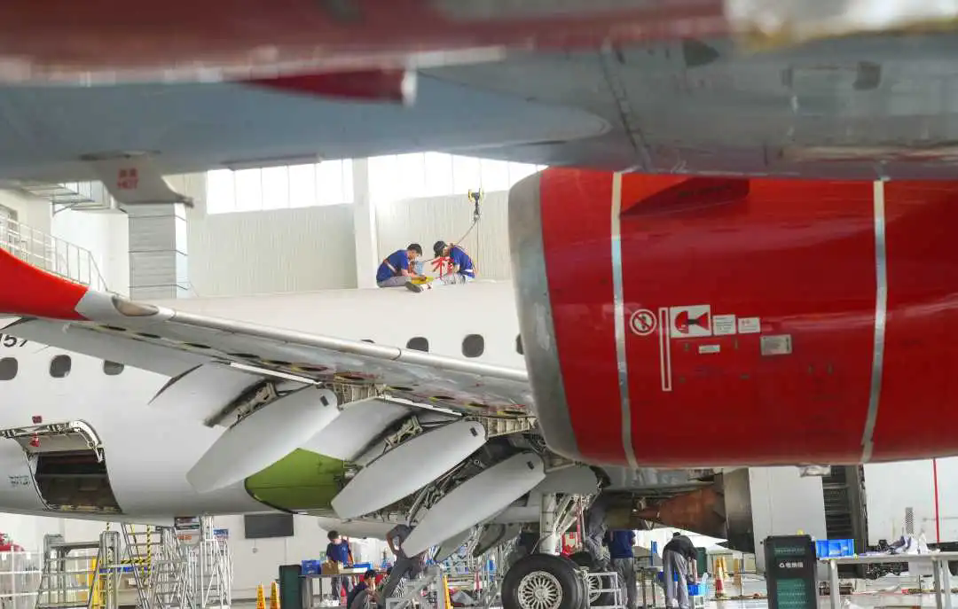 日照山太飞机工程股份有限公司高标准机库内,工人正在对大型客机进行维修保养;该公司在去年成功登陆新三板,是全国首家同时具备大型固定翼飞机和直升机定检维修能力的企业。