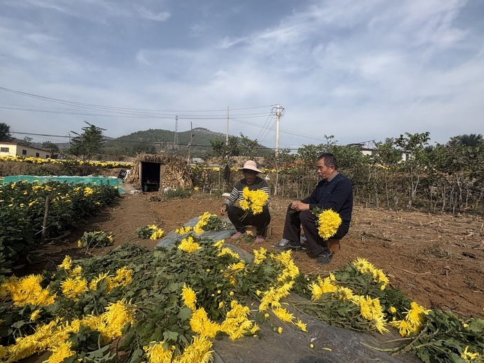 10月底,左而庄村的菊花地内,村民正在采摘菊花。