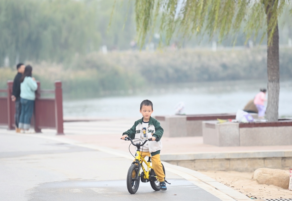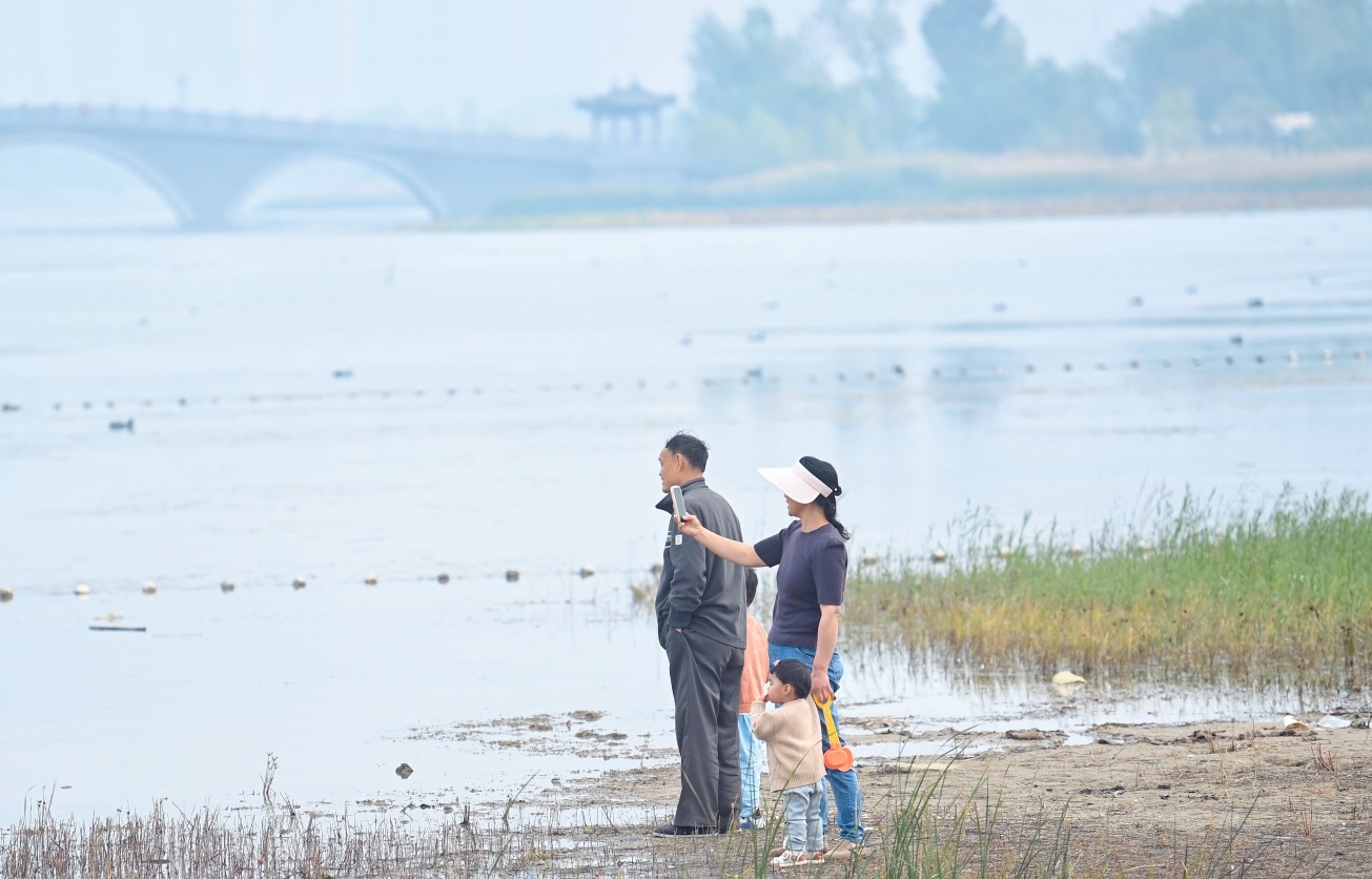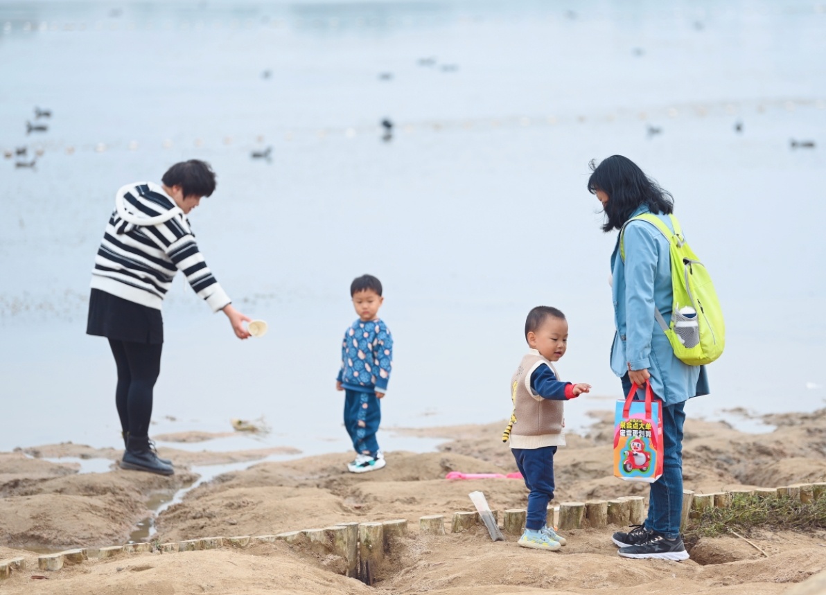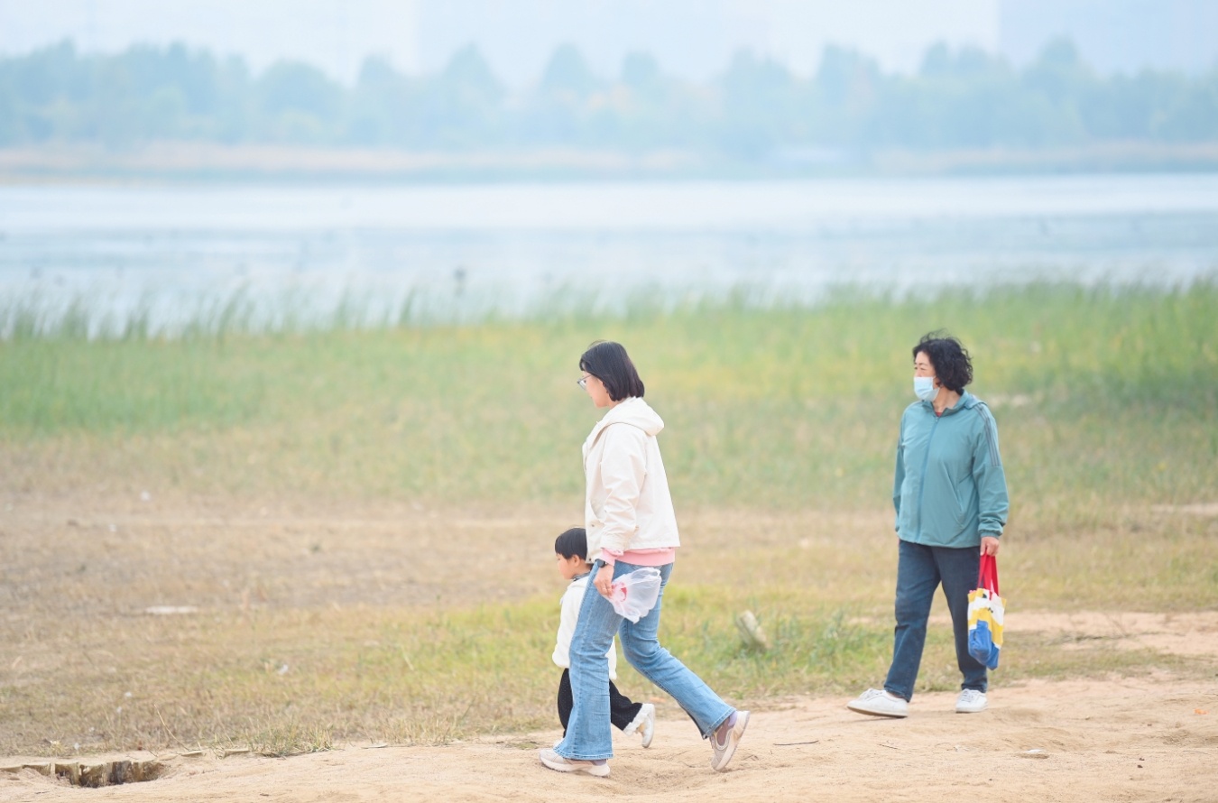 趁着秋高气爽,不少家长带着孩子来到华山湖西侧的沙滩边嬉戏玩耍,观看水鸟畅游在水中,感受“鹊华秋色”的美景。