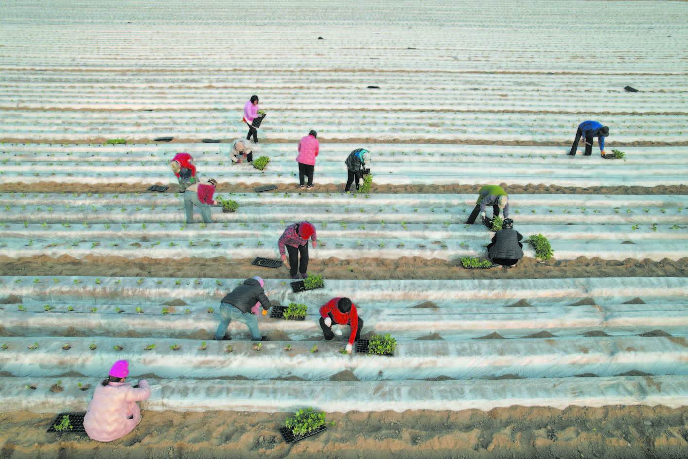 近日,滨州邹平市韩店镇小宋村瑞家种植专业合作社农田里,农民在种植菜花。