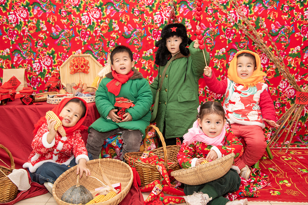 孩子们还换上年味十足的花棉袄、军大衣,在大花布背景和玉米、南瓜、芝麻、腊八蒜等道具的烘托下,孩子们感受到了浓浓的年味,并在镜头前留下珍贵的童年回忆。