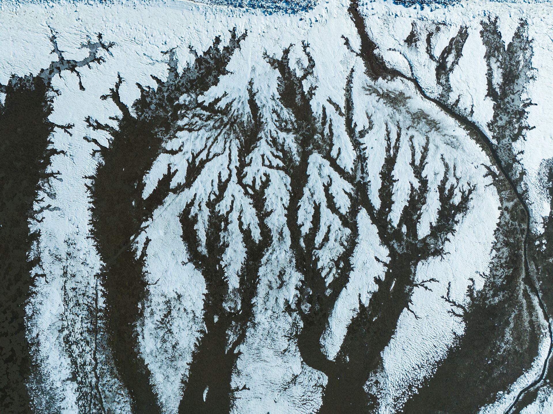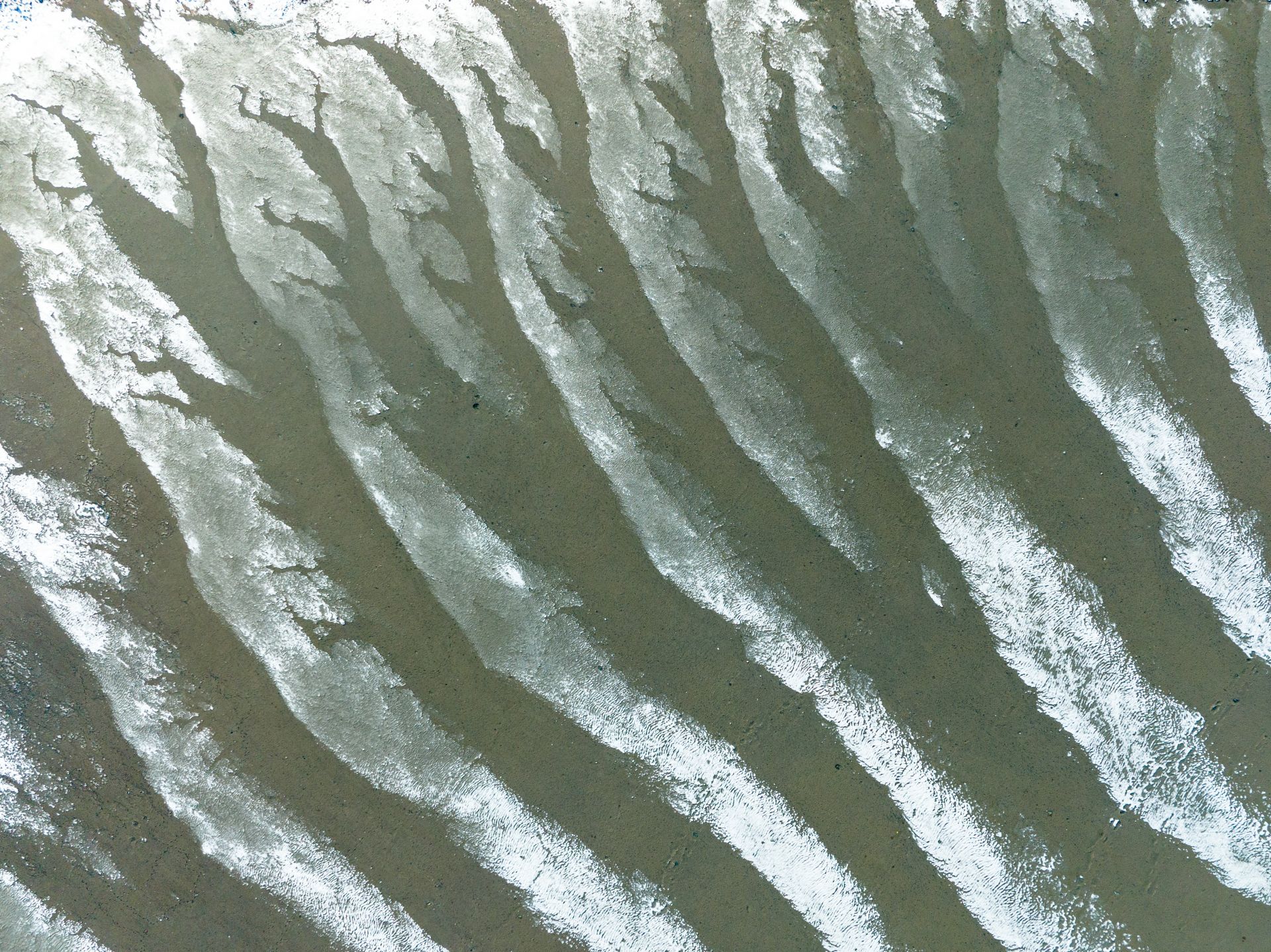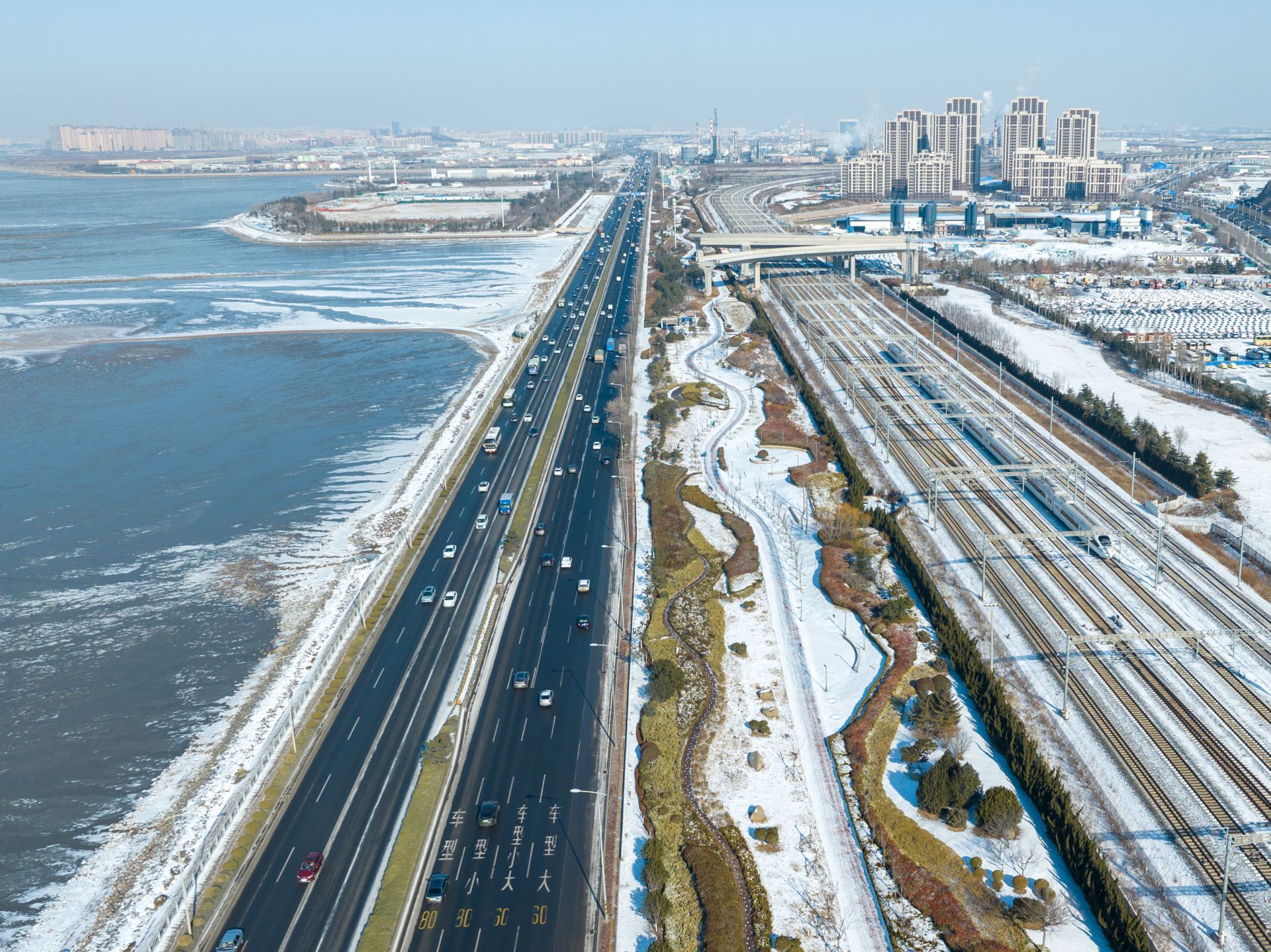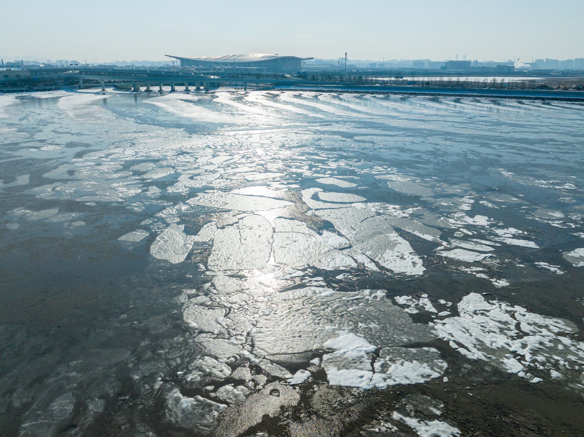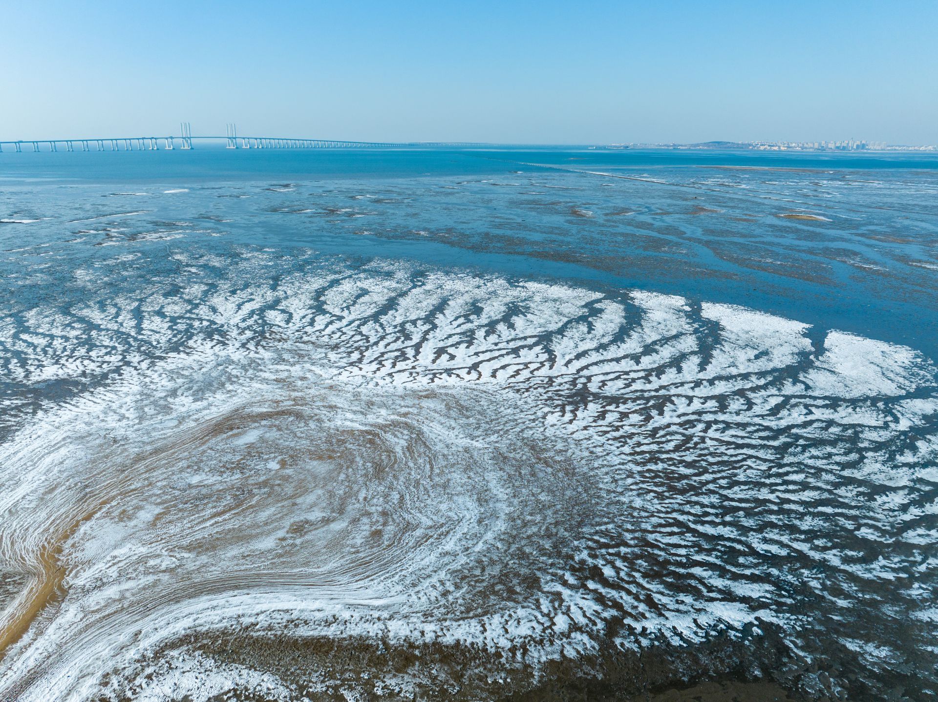 近日,受强冷空气的影响,青岛后海出现冰凌景观,海冰在海面上形成有趣的图案。