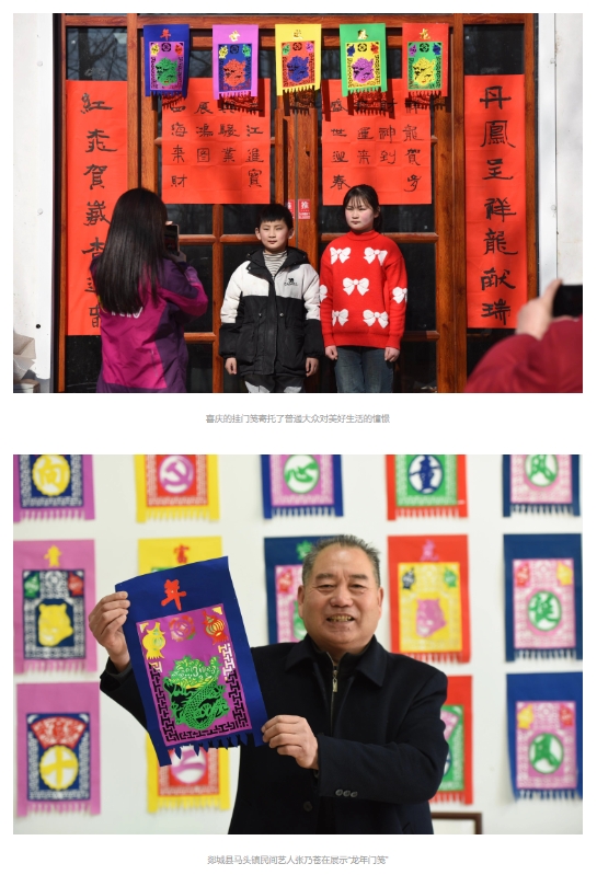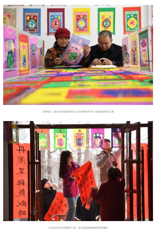 春节将至,临沂市郯城县马头镇农民加工制作龙元素挂门笺供应节日市场。挂门笺一般用彩纸剪刻而成,是春节期间装饰在门楣上的传统饰物。一门五幅,用意是祝吉纳福,和春联、门画交相辉映,成为春节门楣上的一道亮丽风景线。