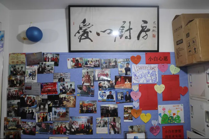 始于“爱心厨房”,但李朋的公益之心并不止于此。顺着厨房往里走,几十平方米的屋子里摆了一张办公桌,桌子下面还放着一张行军床和被褥。墙壁上、橱柜上挂着满满当当的锦旗、感谢信、活动照片和“小白心愿”。