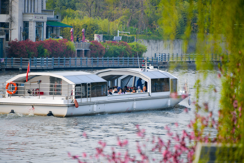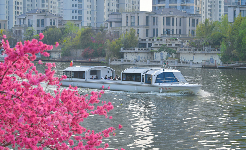 4月8日,游客乘坐水韵琅琊柳青花溪漫游船,欣赏临沂柳青河两岸风光。近日,水韵琅琊观光船——柳青花溪漫游线路正式开通。