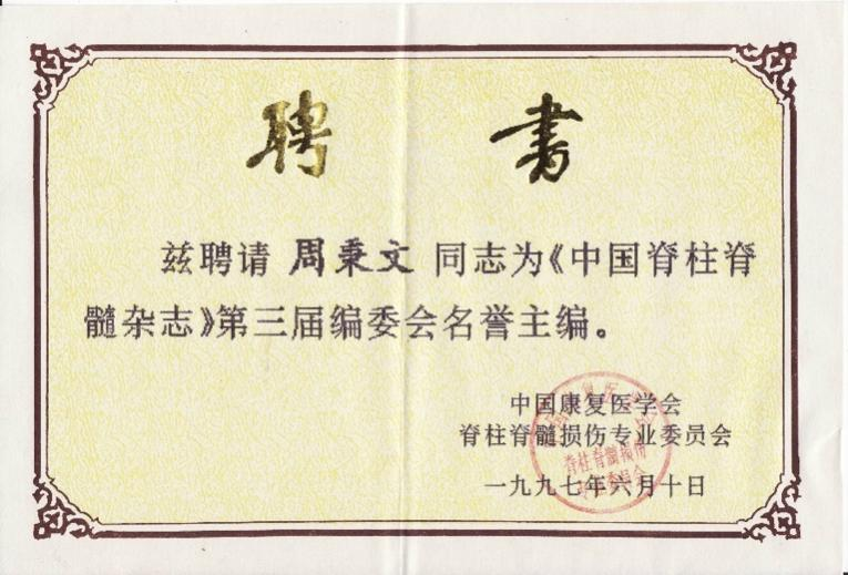 《中国脊柱脊髓杂志》第三届编委会名誉主编聘书