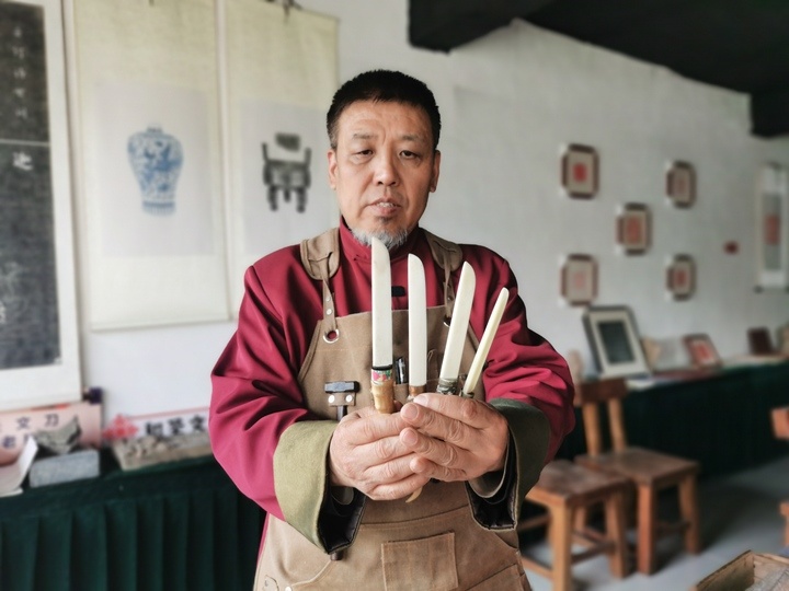 2017年,和圣文刀入选济南市非物质文化遗产,柳森林成为代表性传承人。“我把文刀分为观赏刀、实用刀、把玩刀3类。”他滔滔不绝地介绍着,观赏刀选材考究,造型独特,用来陈列观赏。实用刀侧重于裁纸、翻书等实际功能。文玩把玩刀尺寸较小,便于携带,通常被做成挂件。