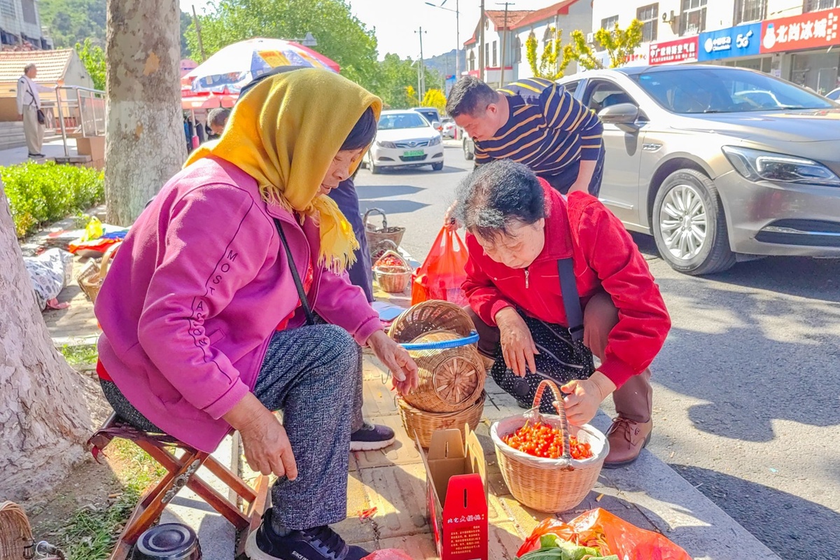 市民游客在路边购买新鲜的樱桃