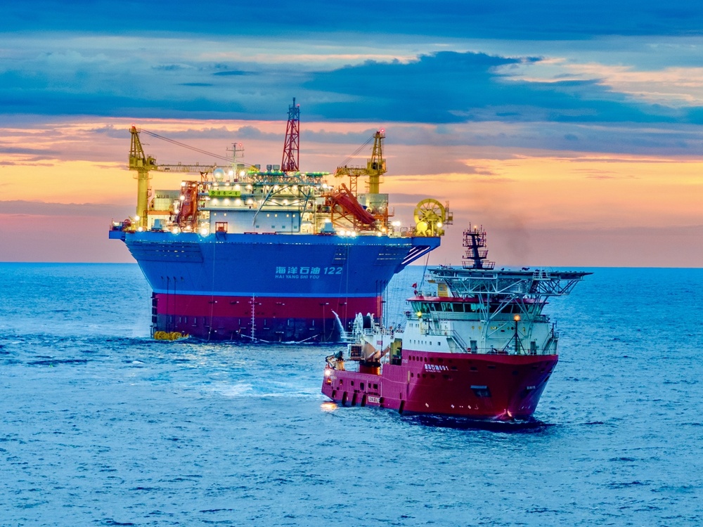 5月29日,在经过长达17天、超1300海里远航后,由青岛建造的亚洲首艘圆筒型“海上油气加工厂”——“海葵一号”抵达流花油田海域,为我国首个深水油田二次开发项目年内投产奠定基础。(王继强 摄)