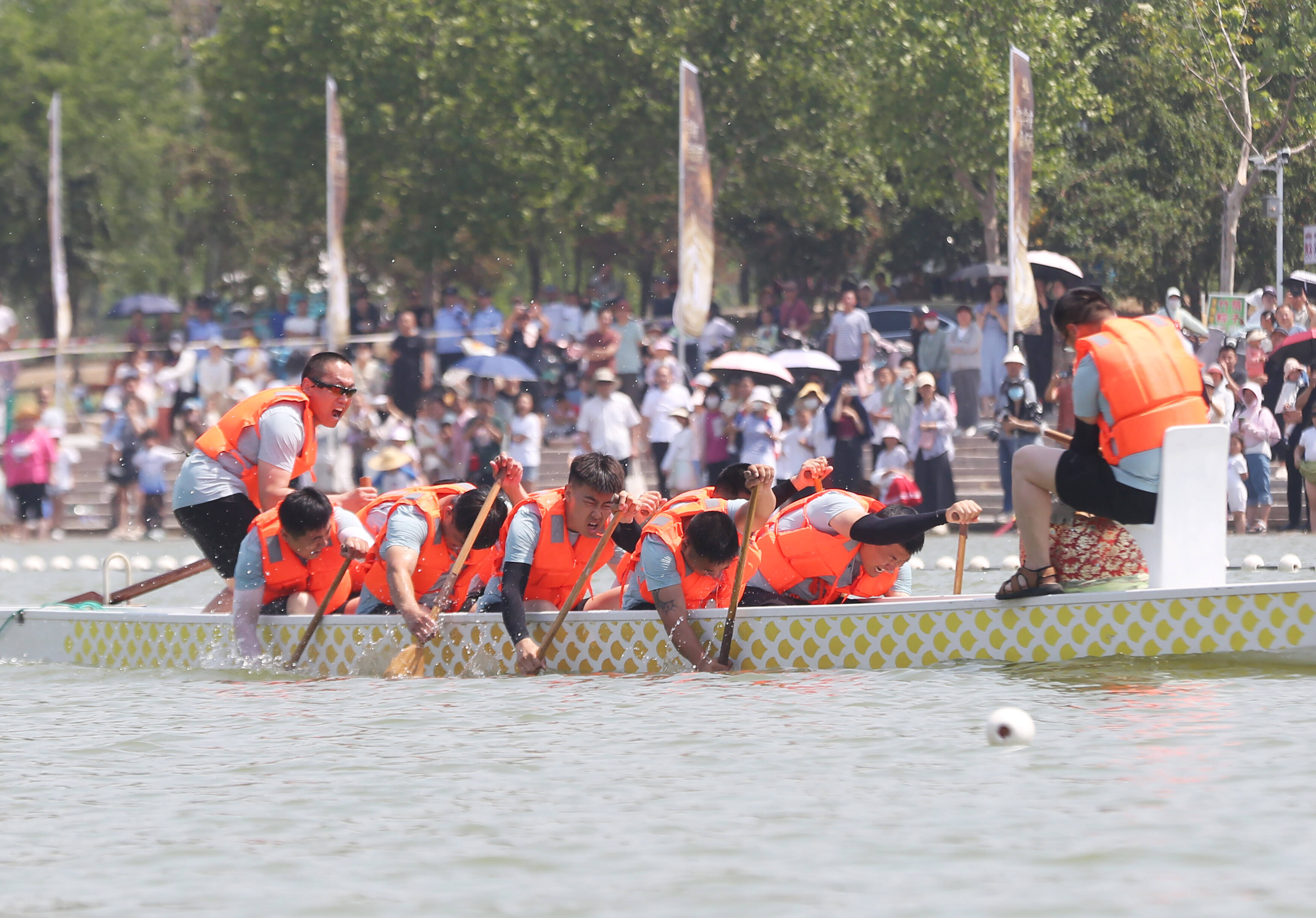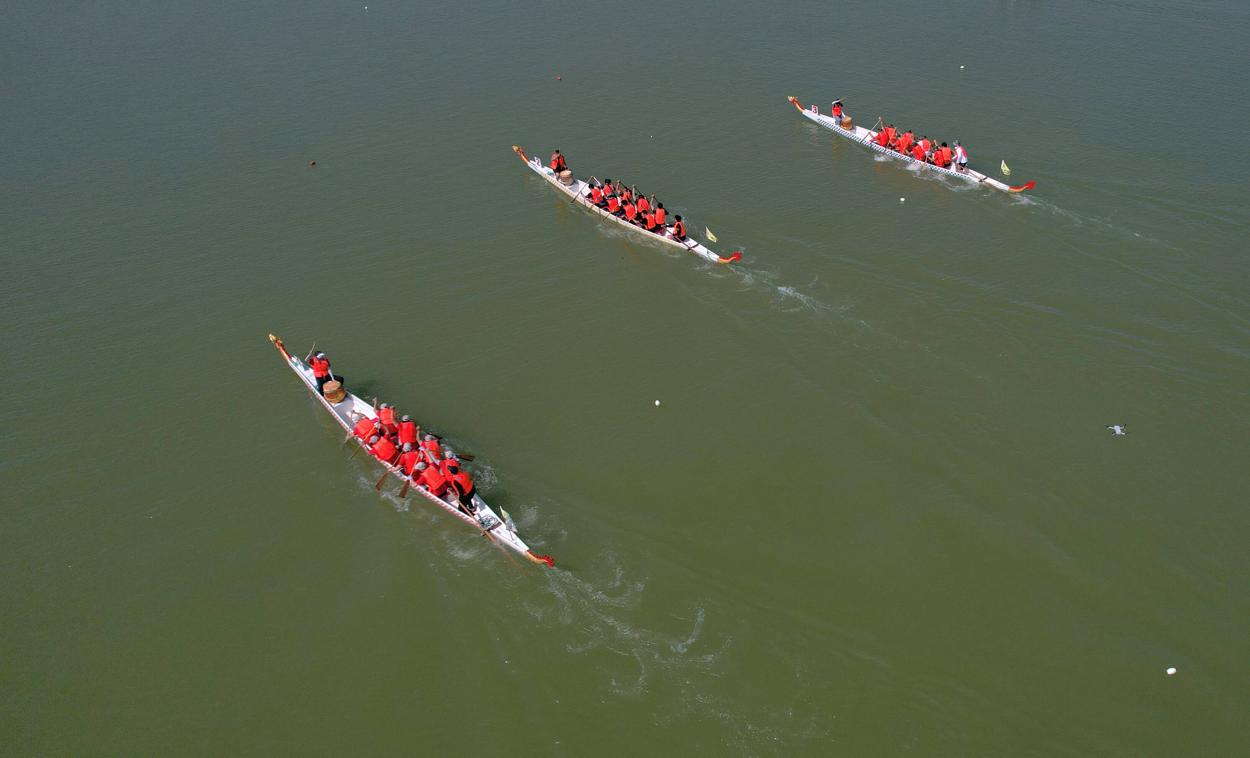 龙舟队在滨州市中海水利风景区水面奋力划桨