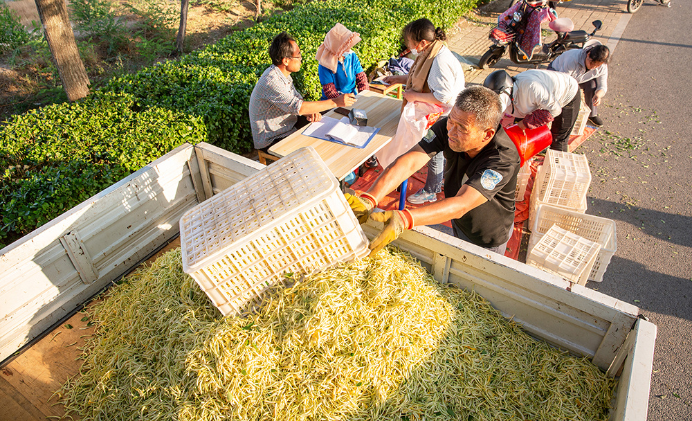 该合作社通过微信群和朋友圈招工,高峰时期有700余人同时采摘。“在这工作的都是附近村民,他们大多数早上送完孩子过来干活,下午学校放学之前称重。接孩子、做饭,啥也不耽误。”弭晓凤告诉记者,采摘金银花完全是“手头活儿”,手速快的村民一天能摘25公斤以上,部分村民一周的收入超1500元。