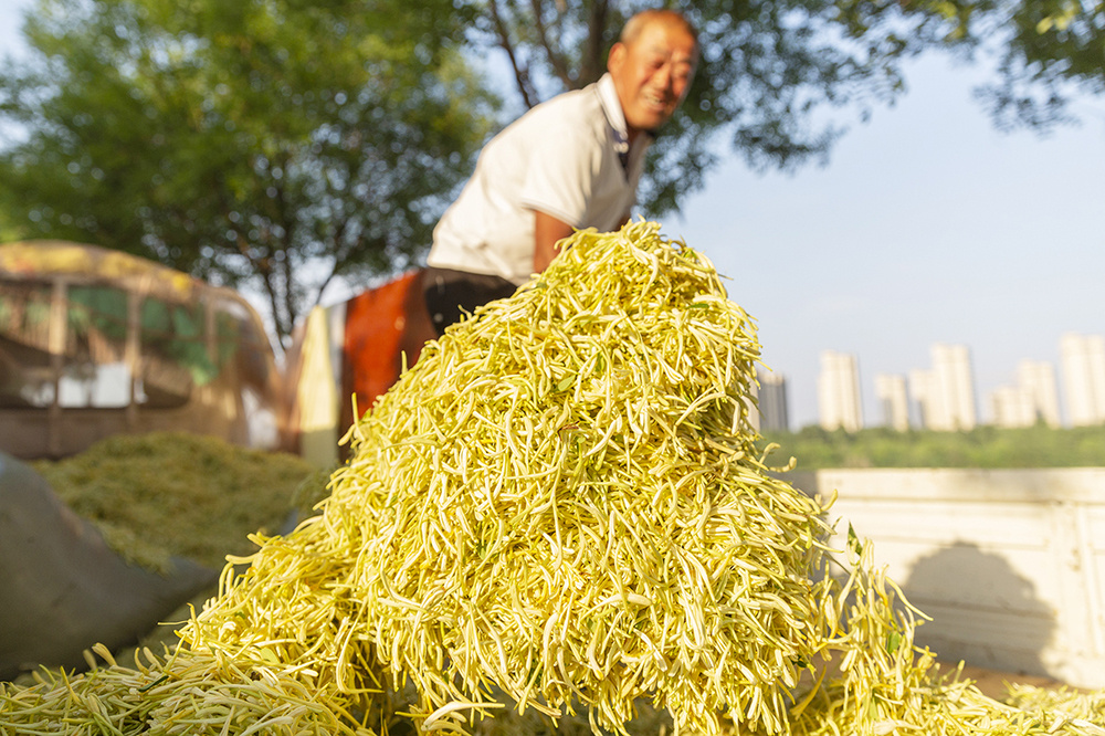 铲起一堆金银花 金黄的花苞分外喜人
