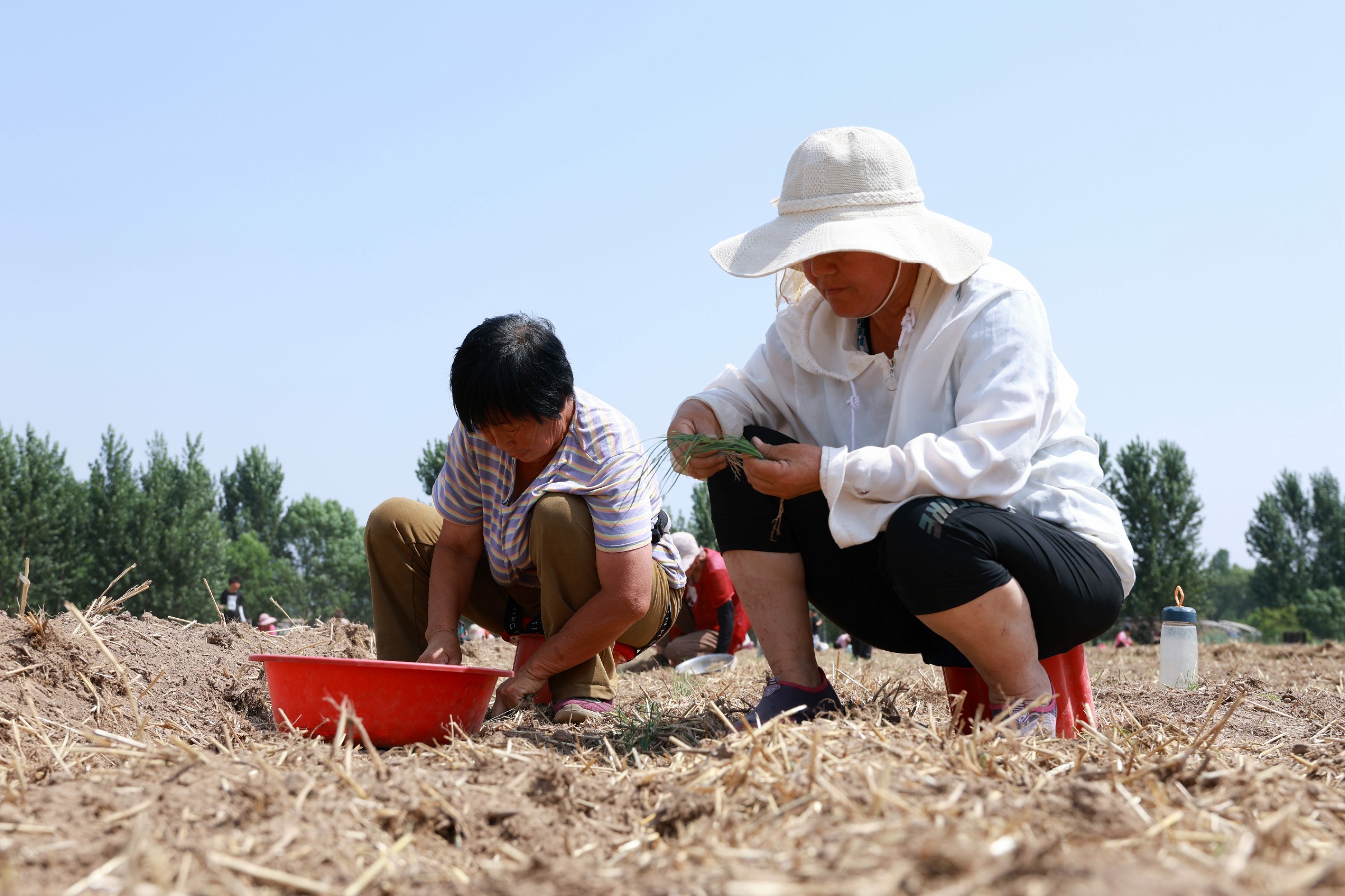 农民精心挑选韭菜苗。