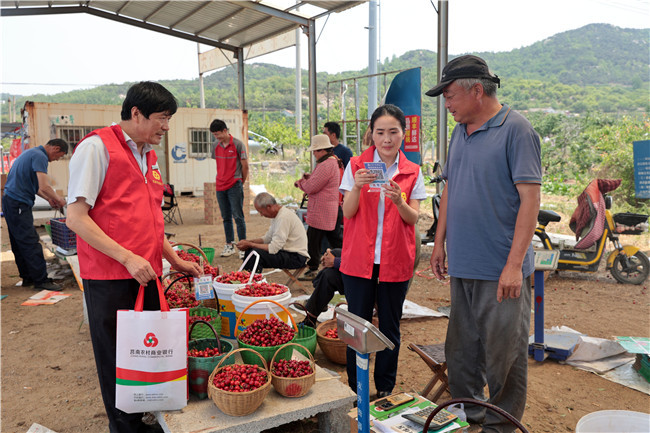 山下的樱桃市场上人头攒动、交易红火。由农商银行“红马甲”们组成的志愿者服务队,从早到晚到樱桃市场开展“驻点办公”,协助果农们记账、过磅、收款,提供存款、贷款、支付结算等基础金融服务,全力满足樱桃种植户、经纪商、合作社、专业市场“一站式”“全链条”的金融服务。