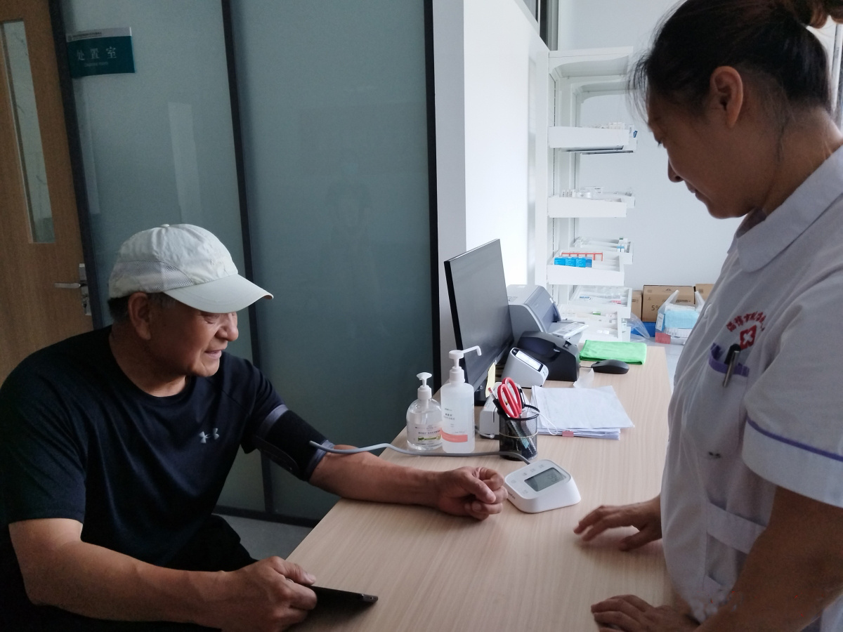 7月12日,居民王先生在城南社区卫生服务站免费测血压。
