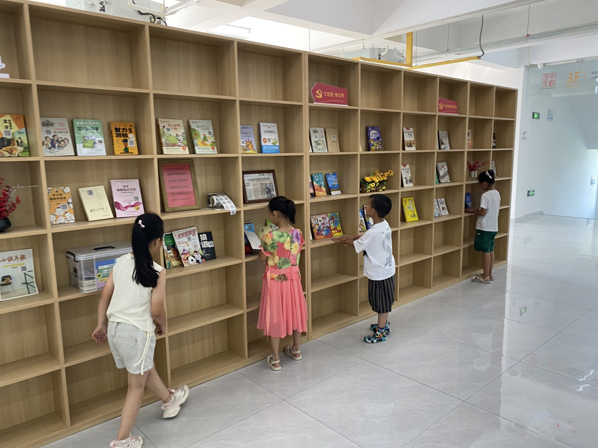 7月12日,孩子们在城南社区邻里中心阅读图书。