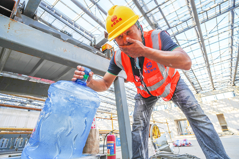 为保证工人身体健康,除了避开高温错峰施工,各项目部还发放足额防暑药品,适时提供西瓜、绿豆汤等为一线工人解暑降温。“虽然在赶工期,但我们一直遵守高温天气作业规定,气温达到一定温度,则会按规定停止作业,工人的健康是排在第一位的。”天衢博览广场一期项目分包负责人张子健说。