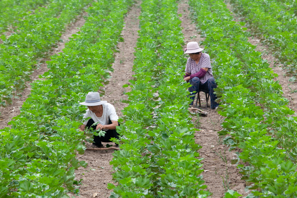 农民在高青县常家镇一处农田里为棉花整枝。