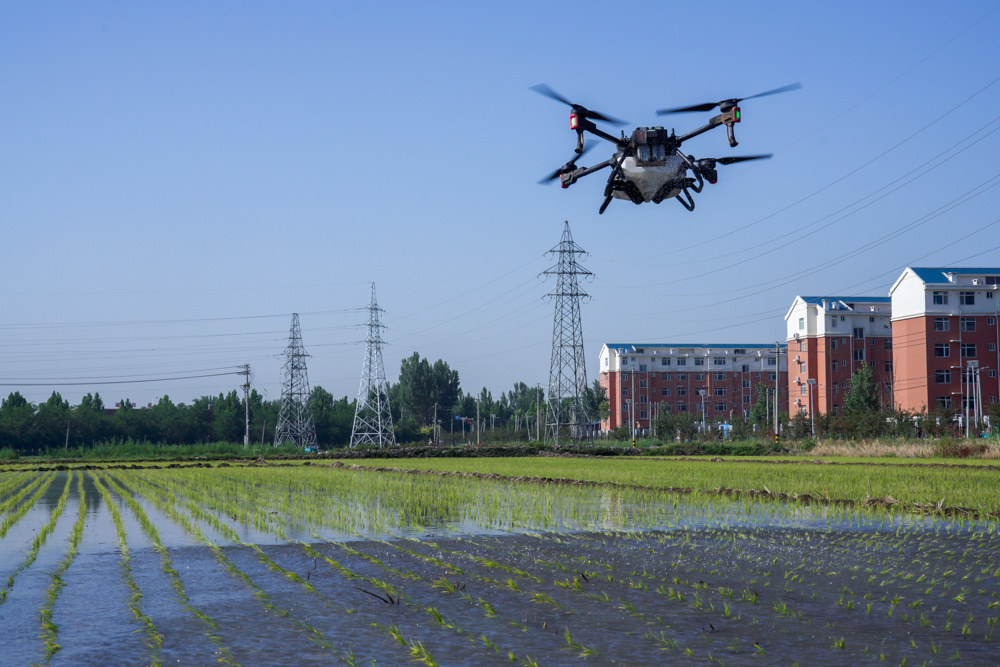 农民在高青县芦湖街道一处农田里为水稻进行植保作业。