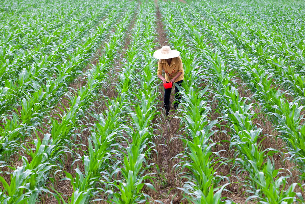 农民在高青县黑里寨镇一处农田里为玉米苗施肥。