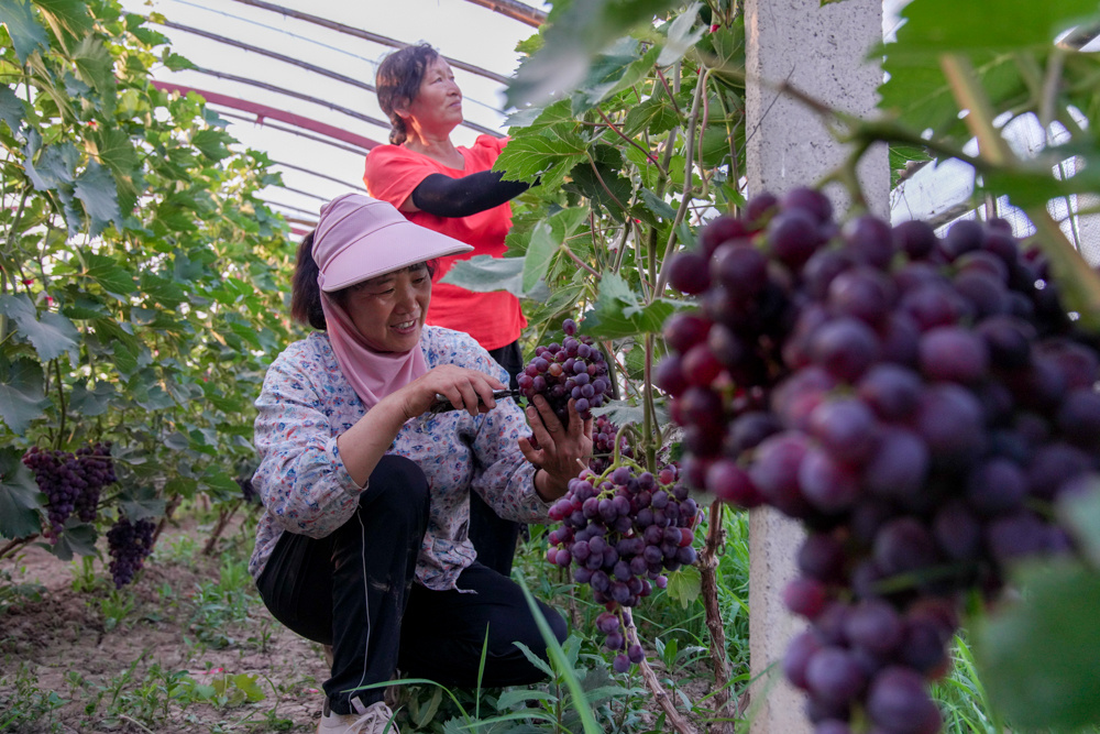 农民在高青县木李镇一处农田里管理大棚葡萄。