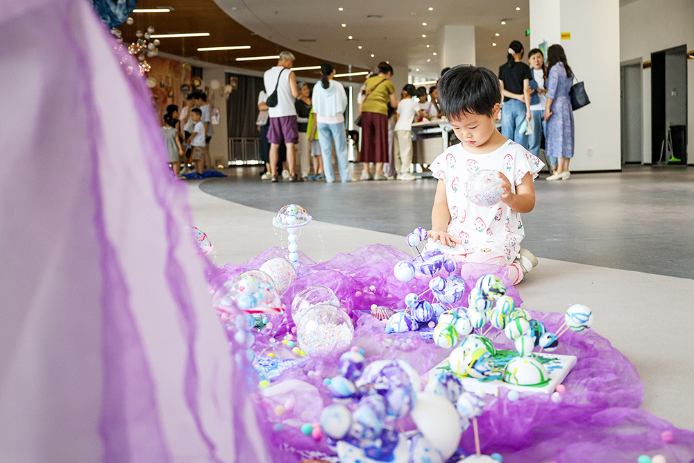 在德城区“大地拾遗”艺术展上,小朋友被有趣的艺术作品吸引。