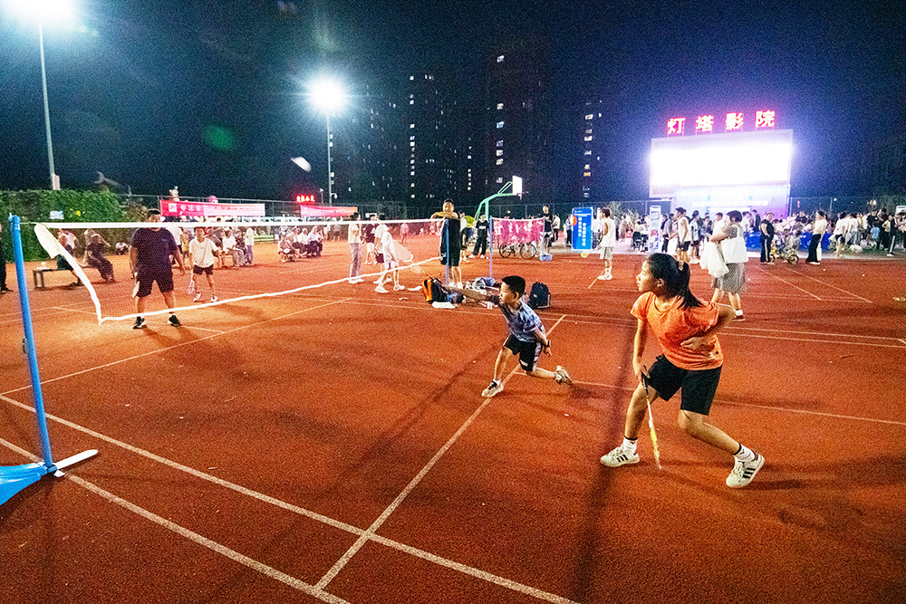 袁桥社区广场上,孩子们组队打球,畅享夏夜。