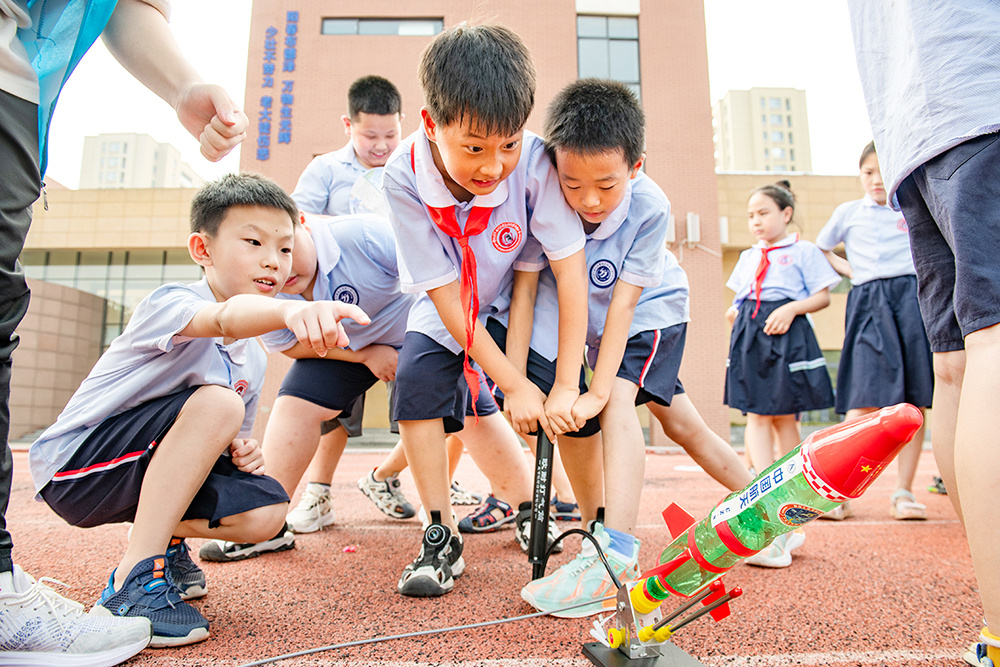 8月1日,在天衢新区尚德小学的操场上,50多名小学生将制好的水火箭发射空中,欢呼声、掌声不断。这是该校为丰富学生暑假生活,携手北京航空航天大学川航e家实践队开展的夏令营活动,实践队带来了航空航天、编程算法、心理生理等多门课程,让小学生们在玩中学、学中思,培养他们探寻科学奥秘的兴趣。