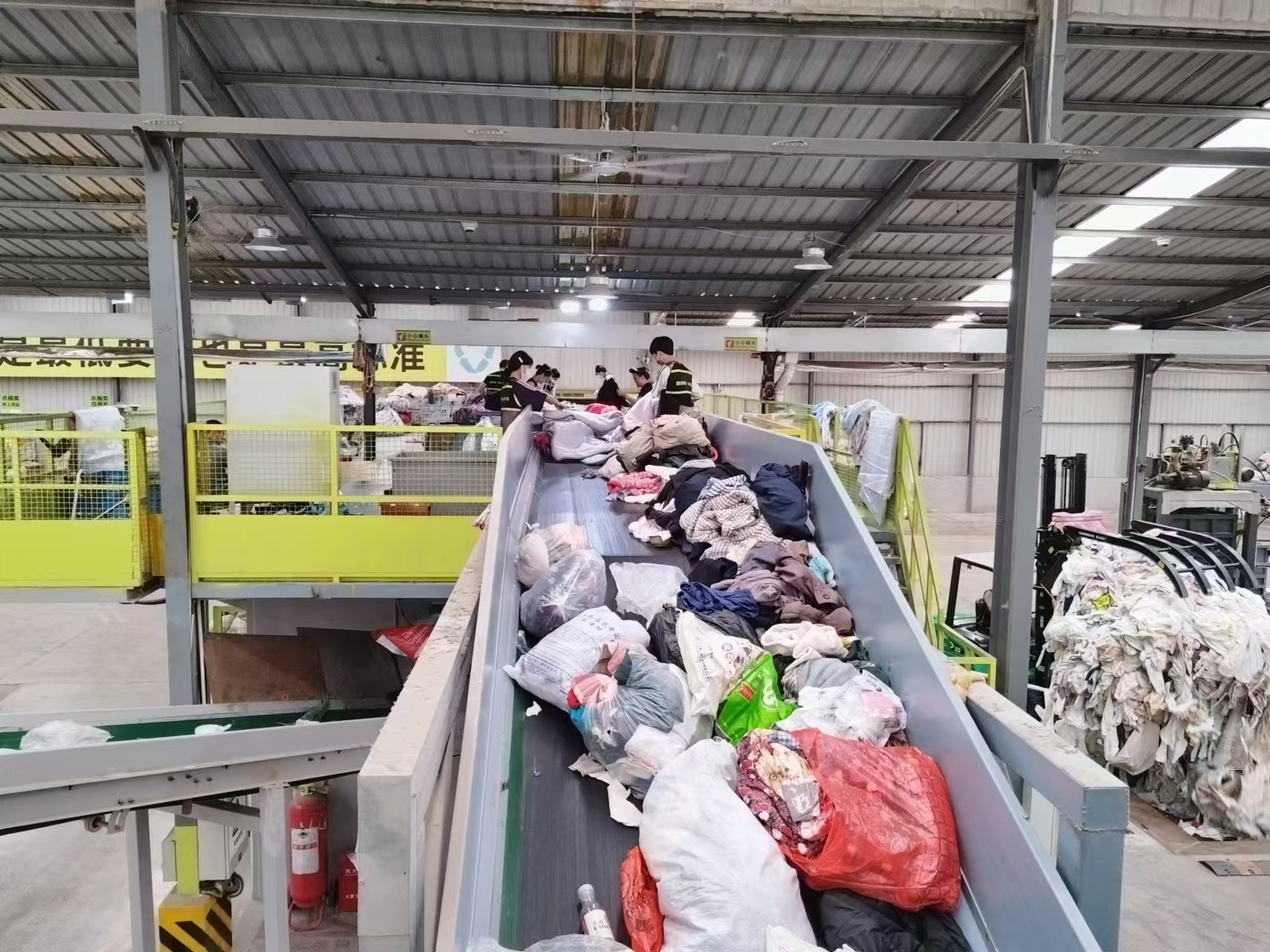 分拣现场,叉车与人工相结合,一袋袋从各小区回收来的垃圾被倾倒在传送带上,60多名工人在二层楼高的分拣台上逐一对其进行分拣,再按照纸板、塑料、衣物等不同种类分别进行投放。在这里,快递包装袋、泡沫盒等物品都单独分类存放。“爱回收·爱分类”项目淄博分公司末端负责人贾哲向记者介绍,泡沫盒经冷溶压缩,可以运送至相关企业进行再生产,避免了因热处理产生有害气体。而场内86类回收物资都可以再次利用,它们或成为下游企业的生产材料,或进入二次循环使用企业,变废为宝。以塑料瓶为例,经过再生处理后,可以做成雨伞等物品。