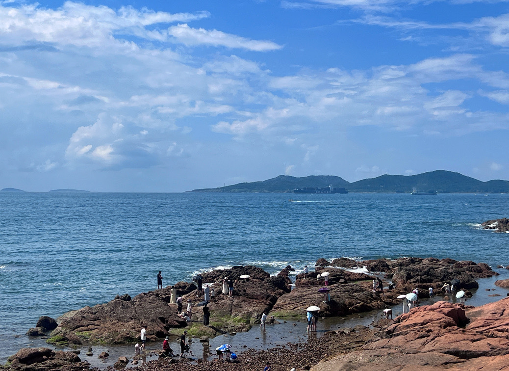 碧蓝的海水仿佛与天际相接,海浪轻柔地敲击着海岸线。游客纷纷攀上礁石,追逐海浪,嬉笑游玩,尽情享受着海风拂面的清凉。
