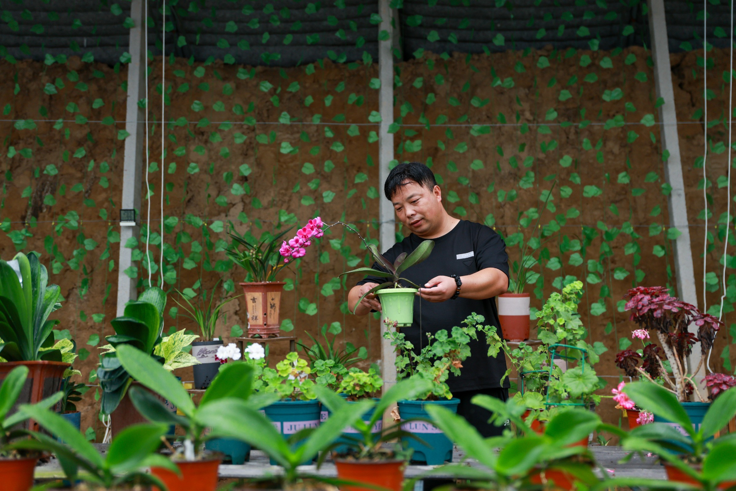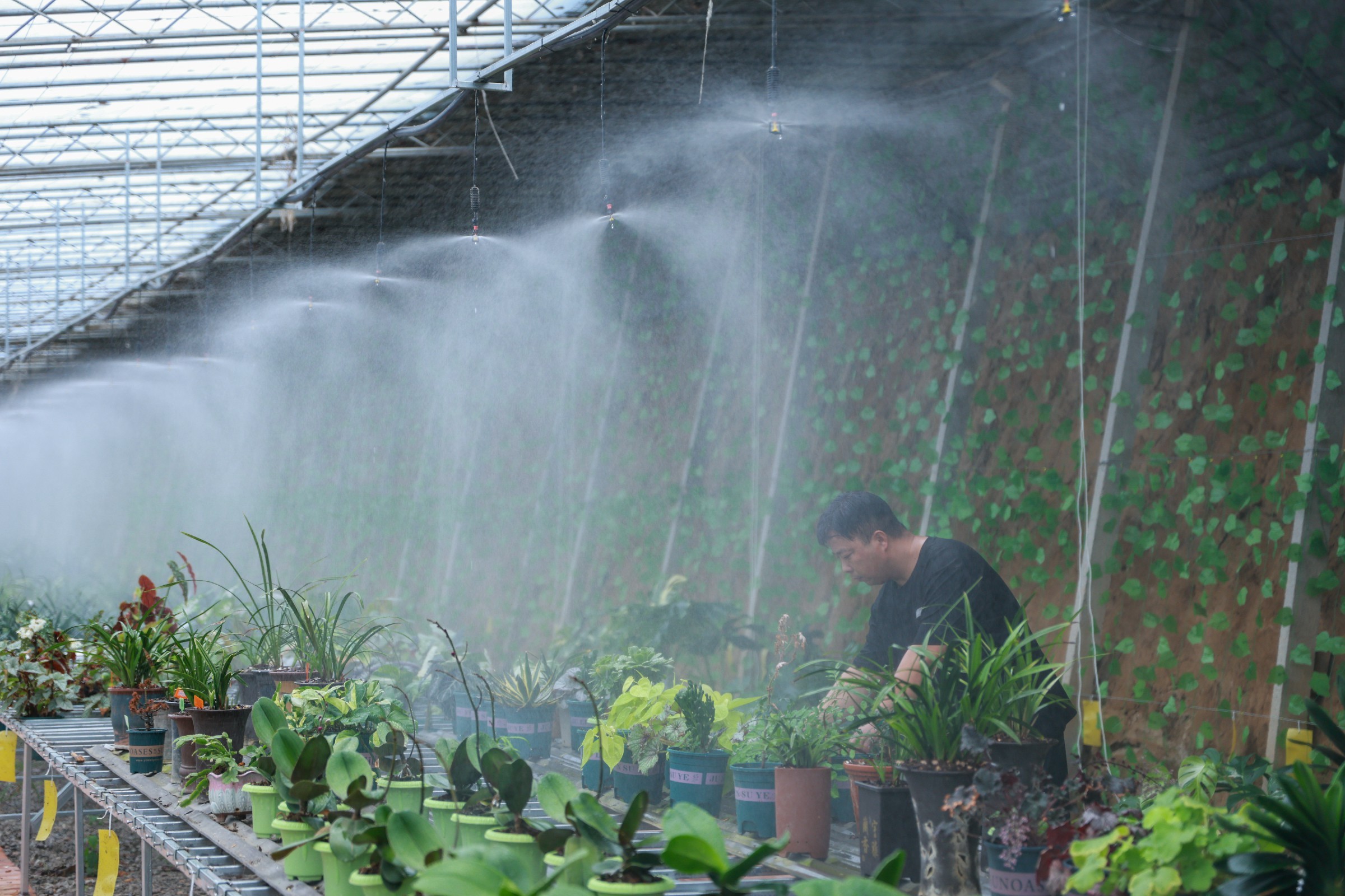 在聊城市茌平区博平镇博陵兰苑农业种植专业合作社,花农在使用自动喷灌设备管护花卉。