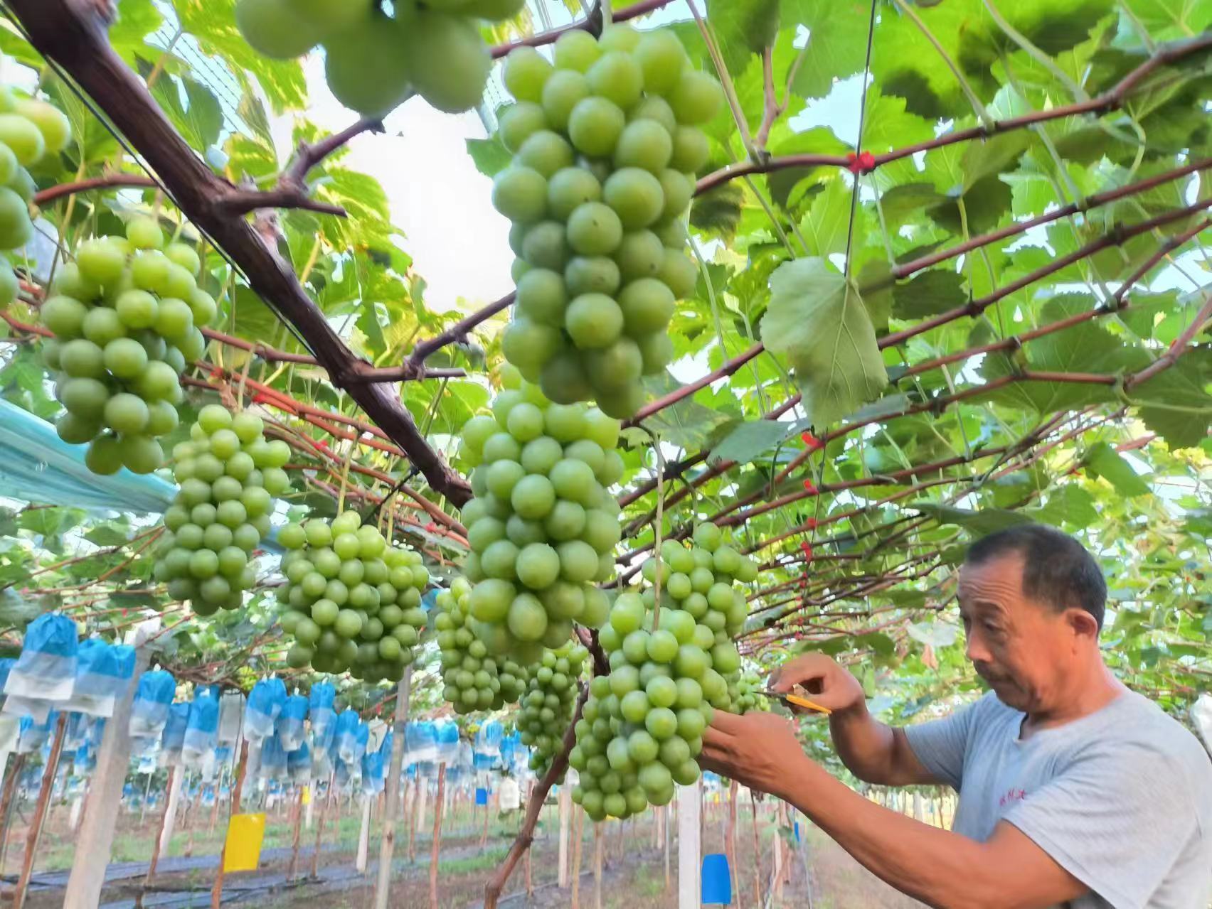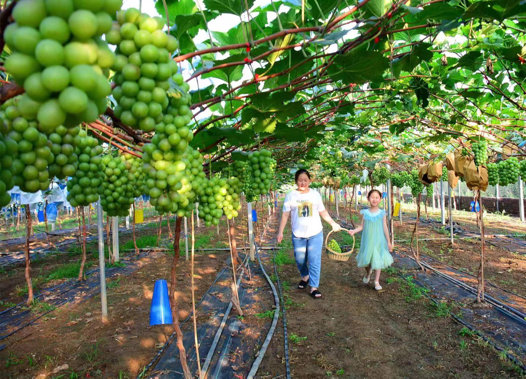 近日,游人在临沂市郯城县郯城街道葡香家庭农场采摘葡萄。近年来,郯城县郯城街道通过全力推进产业结构调整,依托农业资源优势,打造农耕文化园、采摘园等具有本土特色的“农旅融合”,形成新的经济增长点,为乡村振兴赋能好“钱”景。